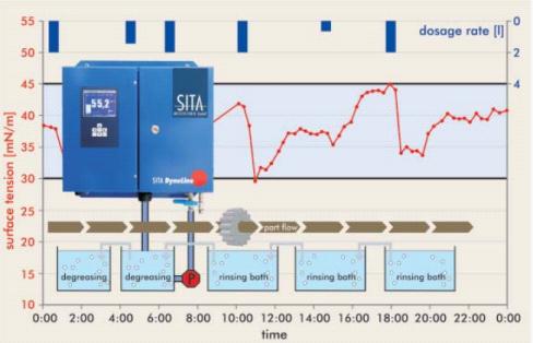 Sita Dynoline(如圖1)廣泛應(yīng)用于連續(xù)監(jiān)測槽液里的表面活性劑含量并可實現(xiàn)自動添加。要在測量過程需要中實現(xiàn)快速和操作簡便同時能監(jiān)測分析溶液浴槽中的整個變化過程,而SITA t15移動式測試儀或手持式測試儀SITA Dyno Tester都可以勝任。