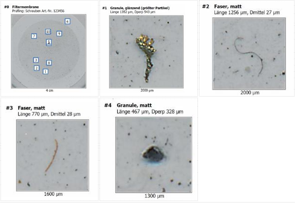 由MicroReporter生成的清潔度測量報告直接顯示在Microsoft Excel®。語言種類可以在英語和德語之間進行切換。十個最大的粒子會顯示在一個圖片庫的頁面。此外,還可以生成趨勢分析和審核報告。