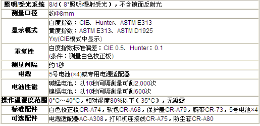 使用白度指數(shù)(CIE或亨特爾)指示食品和原材料的白度。測(cè)量口徑為8mm。測(cè)量、數(shù)據(jù)處理、顯示的三個(gè)部位一體化設(shè)計(jì)。小型輕便的手提式設(shè)計(jì)。可以測(cè)量粉體或粘稠狀物體。